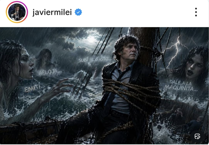 La imágen del presidente Javier Milei atado al mástil de un barco endeble, desoyendo cantos de sirenas, es tal vez la que mejor ilustra estos tiempos. Ratifica que el Gobierno atraviesa una tormenta, tanto a nivel político como económico, y revela que en este momento la administración libertaria no tiene o no encuentra un plan B para ninguna de esas dos esferas interconectadas.