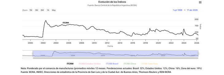 “¿Está bajando otra vez? ¿Hasta cuándo? ¿Qué va a pasar con el dólar?”, se leyó el martes pasado en un grupo de empresarios industriales mientras el tipo de cambio descendía otro escalón. La preocupación es atípica para el escenario argentino de las últimas décadas, donde la mirada estaba puesta habitualmente en si se desataba una nueva corrida en los precios, producto de una eventual devaluación. Lo atípico no quita lo fundado, el tipo de cambio real multilateral medido por el Banco Central de la República Argentina se encuentra en niveles similares a los de octubre de 1998.