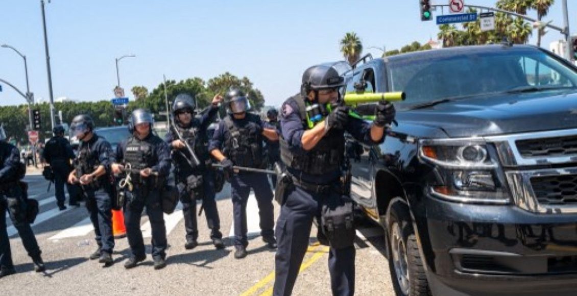 En el enfrentamiento, agentes federales y soldados militares dispararon granadas aturdidoras y gases lacrimógenos contra los manifestantes que se oponen a la detención de decenas de migrantes en la ciudad de Los Ángeles y Nueva York.
