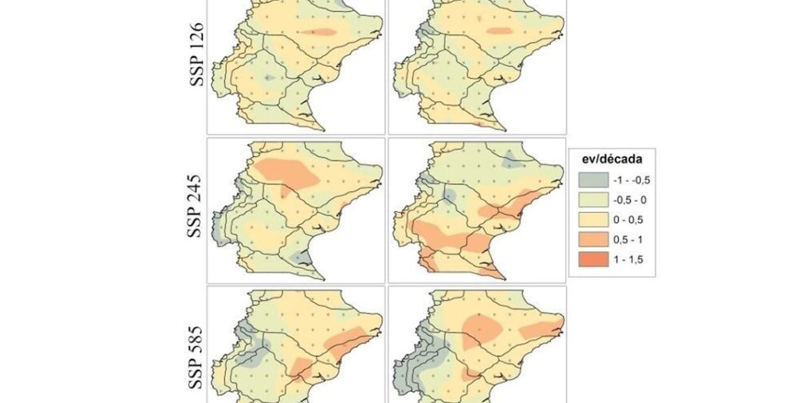 A partir de allí establecieron once regiones climáticas para la provincia y los resultados fueron contundentes: gran parte del territorio ya muestra una tendencia negativa en las lluvias y el panorama podría volverse aún más crítico hacia el año 2100.